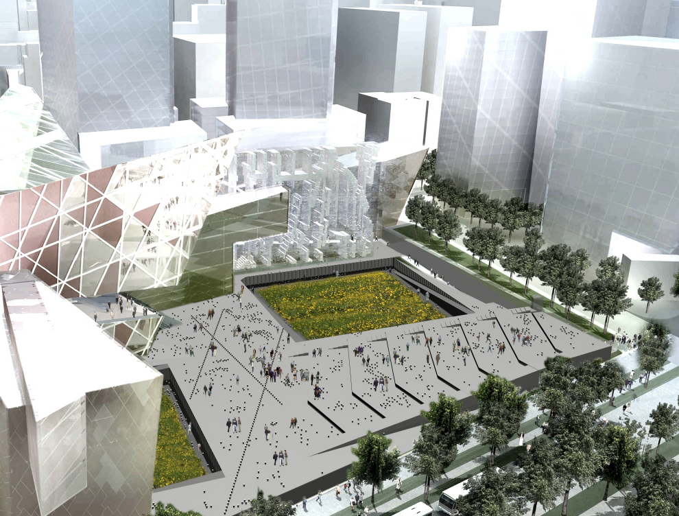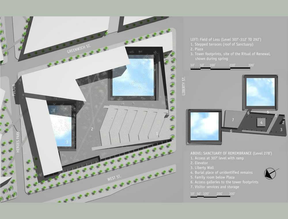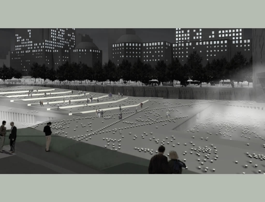 What needed to be commemorated in a memorial to the events of 9-11-2001? The loss of New York’s symbolic gateway? The loss of 3,022 lives? The city’s ability to recover after such a monumental blow? The solidarity among New Yorkers and from all over the world during the period of mourning? These were all important for the construction of a specific memory and that is why this proposal is conceived not merely as a place, but as a ritual of renewal. Seasonally, changes would be made visible within the footprints of the World Trade Center towers. The ritual would begin on September 11 of every year, as mist rises from the floor, evoking the sadness and lack of certainty after the attack on the towers. The mist would be replaced in the spring by cleansing water filling the footprints and reflecting the sky. In summer, the reflecting pools would be planted as meadows until the next September, as the ritual continues to re-inscribe the event’s memory. Three thousand and twenty two unique, artificial, translucent “stones” the size of a hand would be strewn throughout the site, conveying the magnitude of human loss – they would be lit at night; the names of those lost would be engraved in the walls of the sanctuary below the space overlooking the towers’ footprints.