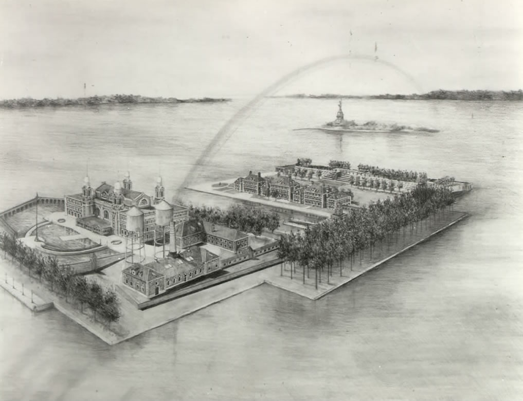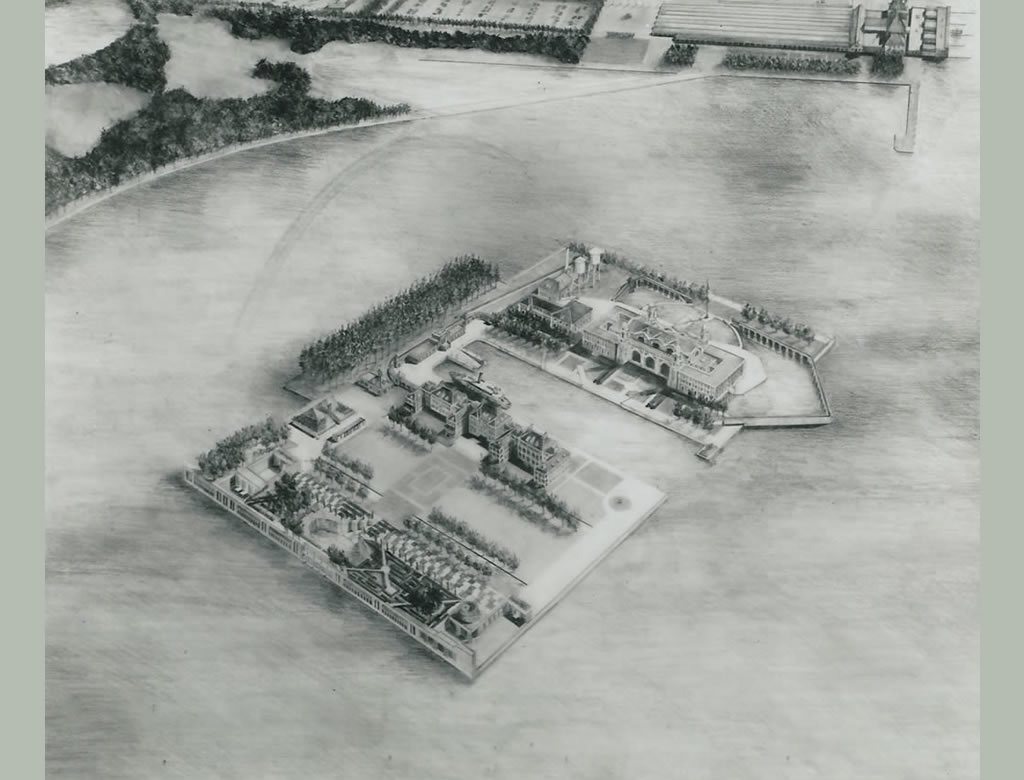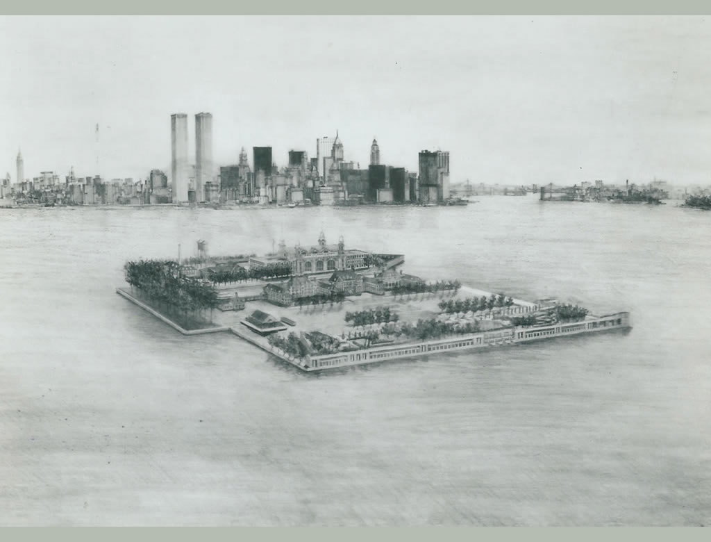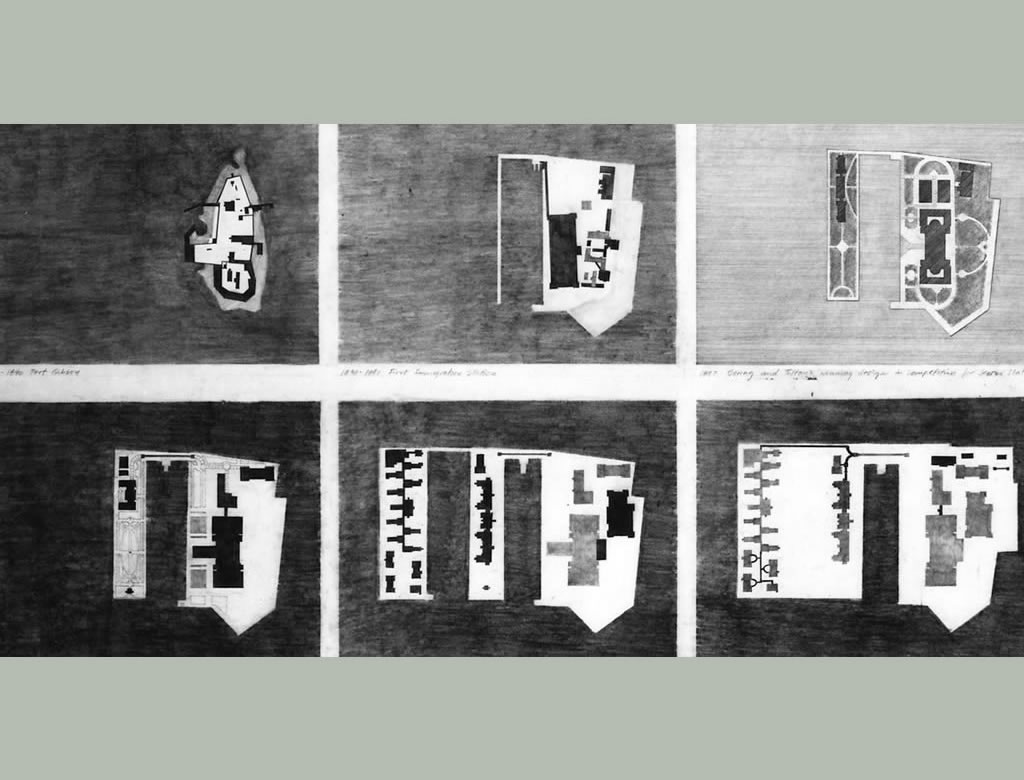 From 1892 to 1954, Ellis Island was the major point of entry for 16 million immigrants to the US, all of them poor, many displaced by political and economic events in their homelands. In 1980, nearly half of the US population had either entered through Ellis island or was descended from those who had, but there was no place in the US to commemorate that experience or the immigrants’ contributions to America’s multicultural society. The island was inaccessible to the public, and the foundations of the Hospital and its isolation pavilions were partially under water. This design proposed to transform the derelict island into a memorial and a place for festivals and other events celebrating the culture of different ethnic and national groups. Its point of departure was recognition of the fracture involved in starting anew in a harsh and sometimes hostile environment; the design is a reflection about the capacity of landscapes to elicit deeply emotional responses recalling experiences of dislocation and journey. One half of the island, containing the historic Immigration Station turned museum, would be a fragmented landscape, made up of the archaeological record of the island’s changing outline throughout its history. The other half would have a large green area flanked by a Center for the Study of Ancestry in the former Hospital and a stepped structure sheltering the ruined pavilions and providing seating to watch events in the central space. This new structure’s southern deck would frame a view of the Statue of Liberty as the immigrants would have first experienced it, while the labyrinth garden on the uppermost level would suggest a metaphorical journey. The forest covering the connection between both sides of the island would be a reminder of the wilderness that was replaced with prosperity though agriculture, as promised in the booklets handed out to prospective illiterate immigrants by the ship companies at the beginning of the 20th century.