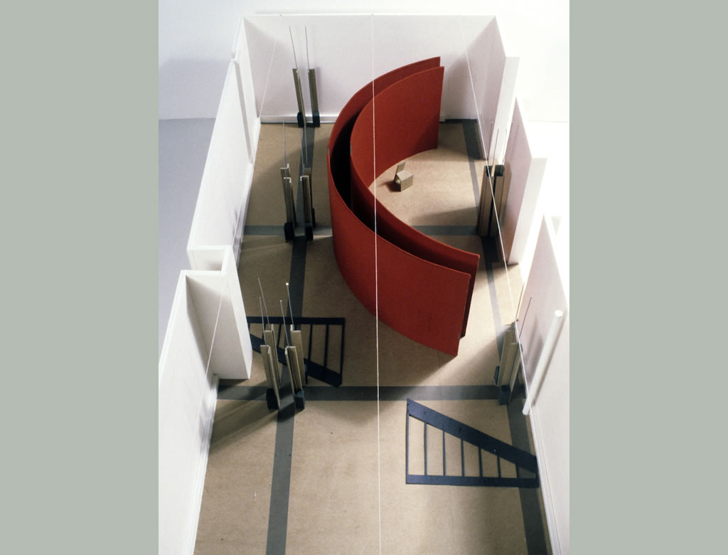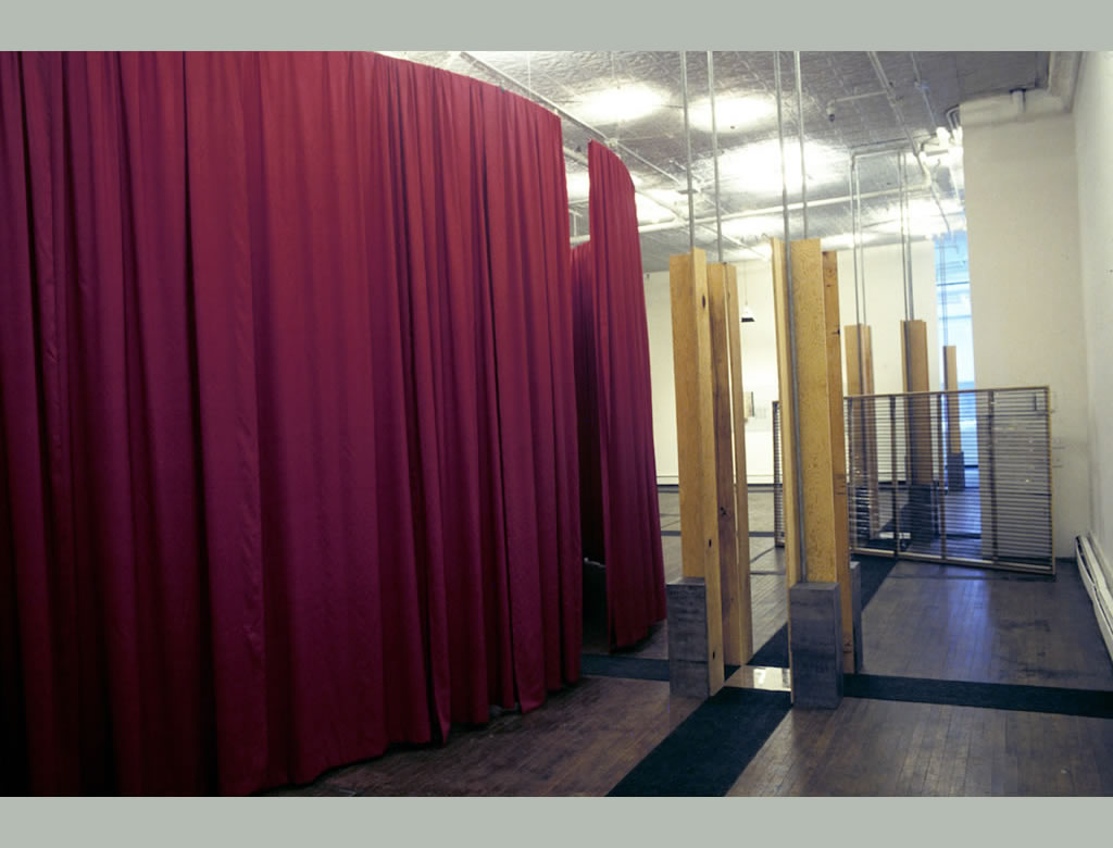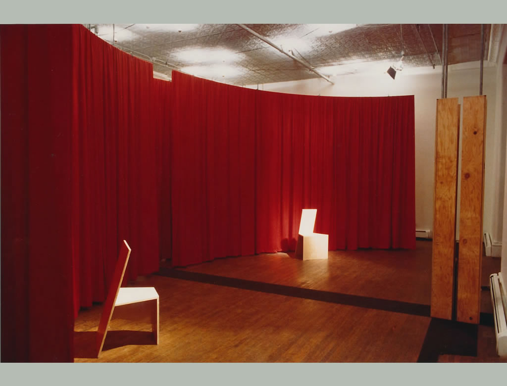 Architecture exhibits typically consist of photographs, drawings and models about architecture, without allowing the visitor to actually experience architectural space. This installation was meant to provide that experience, and to present a critique of the polemic between Modern and Post-modern space that permeated architectural discourse in the mid 1980s. In that polemic, many critics considered the discrete enclosures (“rooms”) of Post-modern space “retrograde” because they seemed to be a throw back to the strictures of load-bearing walls, in contrast to the “infinite” space of a structural field without boundaries that was said to be Modern architecture’s enduring legacy. Enclosure and openness were assumed to be opposing and irreconcilable ideas. Yet enclosures existed in amalgamation with the most radical versions of the Modern free plan, as in the Velvet and Silk Café, designed by Lily Reich’s for the Women’s Fashion Exhibition in Berlin in 1927. Because of the lack of comparative studies of the work of male and female Modern architects, even when they worked together like Mies Van de Rohe and Lily Reich, we have overlooked spatial proposals such as Reich’s as well as other examples of enclosure in Modern architecture. The chairs within the enclosure, which I designed to force the human body into an accusatory position, seem to demand of the open Miesian column an acknowledgement of the silk enclosure’s modernity as its rightful counterpart.